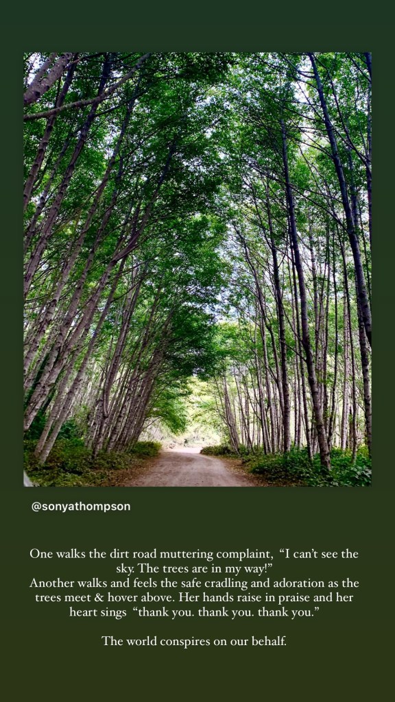 Another walks and feels the safe cradling and adoration as the trees meet & hover above. Her hands raise in praise and her heart sings “thank you. thank you. thank you.”