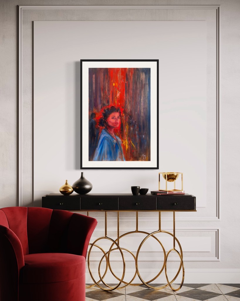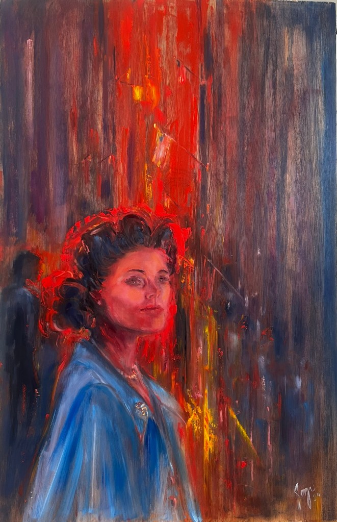 The streets are busy with celebration. The war is over. Flags are flying and the busy street at sunset is glowing like fire. But she’s searching and hopeful to find her soldier. Wearing her blue coat with her sweetheart pin, she stays hopeful that he is coming home. Uncertainty, anticipation and longing mingle in shades of red and blue.
